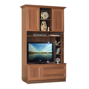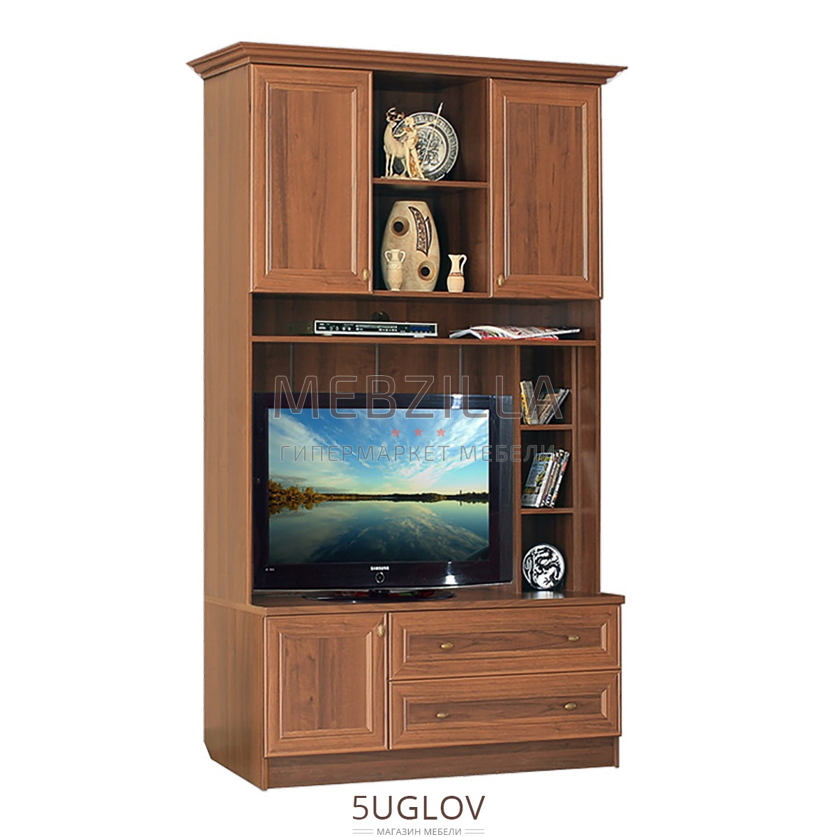 Классическая функциональная витрина №3 входит в состав элементов модульной гостиной Диана Люкс. В витрине размещены два шкафчика с глухими дверцами и три открытых полки в верхней части, ниша для установки телевизора с радом небольших вертикальных полок в средней части и шкафчик и два выкатных ящика в нижней части. Ручки дверец изготовлены из металла. Конструкция витрины №3 гостиной Диана Люкс является универсальной, т.е. может быть собрана как на левую, так и на правую стороны.