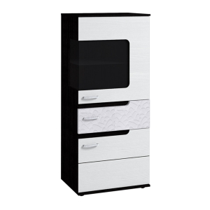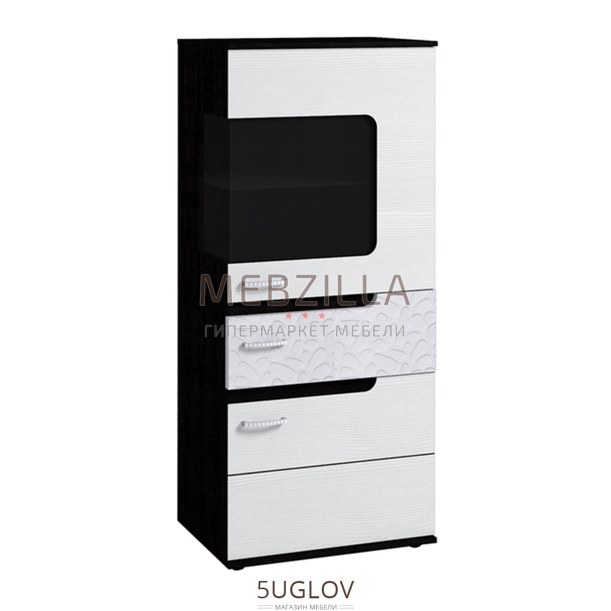 Шкаф для посуды Ирис состоит из трёх отделений: в верхнем за стеклянной дверкой находятся одна стеклянная полка, в среднем выдвижной ящик, а в нижнем одна полка за глухой дверцей. Дверцы со стеклом плотно закрываются благодаря магнитным защёлкам, а вырезы на дверцах облицованы кромкой ПВХ. Мерцающие блики на рельефных вставках фасада и ручках со стразами подчёркивают модный стиль.Такая витрина всегда будет служить оригинальным украшением гостиной WYSPAA.