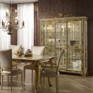 Витрина трехдверная из комплекта «гостиная Катя». Модель включает в себя стеклянные дверцы за которыми расположено зеркало и три стеклянные полки. Также в верхней части присутствует освещение. Модель выполнена в классическом стиле. Декоративные элементы создают уникальный стиль вашей мебели. Очень функциональная и практичная, идеально впишется в интерьер.