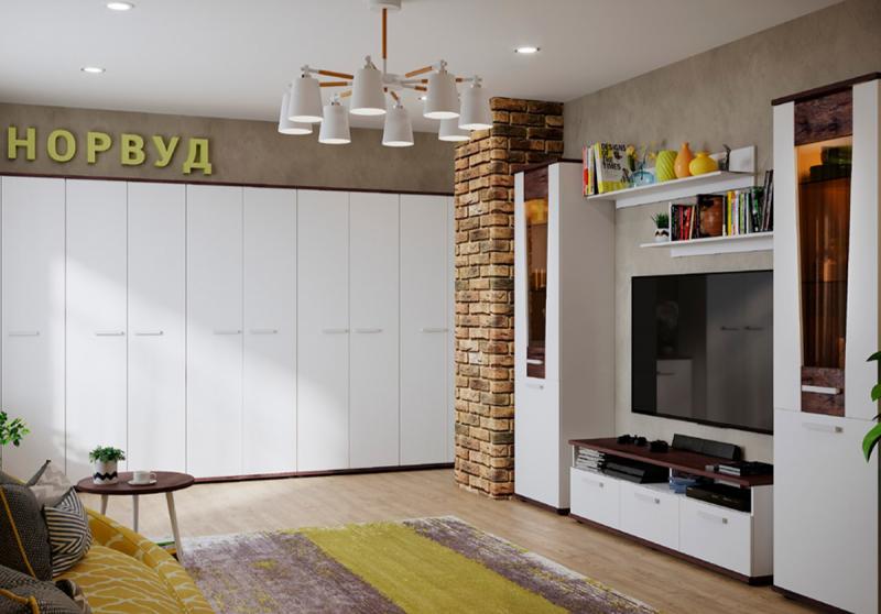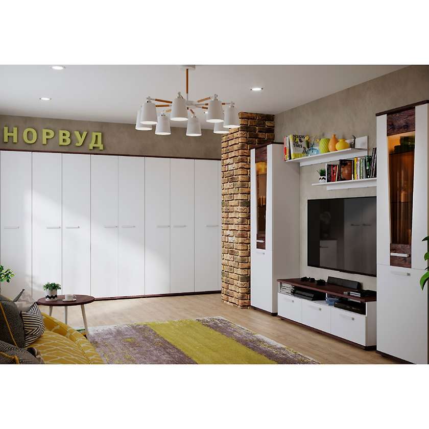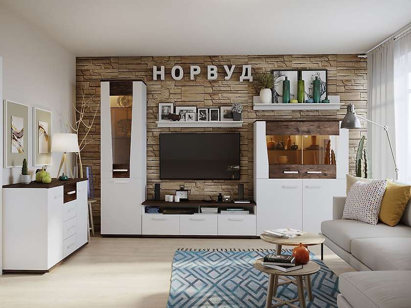 Коллекция Норвуд выполнена в скандинавском стиле, близком к минимализму, и станет прекрасным выбором для вашей гостиной. Основным цветом в палитре скандинавского стиля является белый, он хорошо отражает свет и зрительно увеличивает пространство. Контрастные горизонтальные поверхности в декоре Орех Шоколадный разбавляют белые фасады модулей. Все вставки покрыты лаком, подчеркивая рельеф структурной поверхности, делая рисунок деревянной вставки более объемным и выразительным. В качестве декора лучше всего использовать предметы из натуральных материалов: деревянные рамки с фотографиями, фигурки, металлические подсвечники.