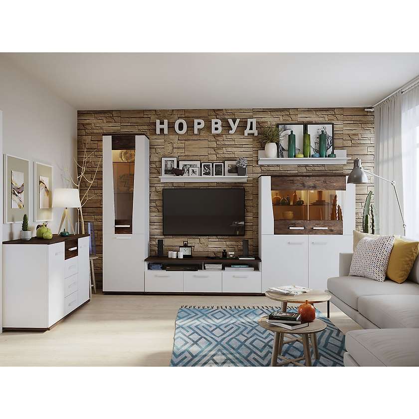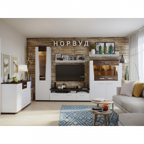 Коллекция Норвуд выполнена в скандинавском стиле, близком к минимализму, и станет прекрасным выбором для вашей гостиной. Основным цветом в палитре скандинавского стиля является белый, он хорошо отражает свет и зрительно увеличивает пространство. Контрастные горизонтальные поверхности в декоре Орех Шоколадный разбавляют белые фасады модулей. Все вставки покрыты лаком, подчеркивая рельеф структурной поверхности, делая рисунок деревянной вставки более объемным и выразительным. В качестве декора лучше всего использовать предметы из натуральных материалов: деревянные рамки с фотографиями, фигурки, металлические подсвечники.