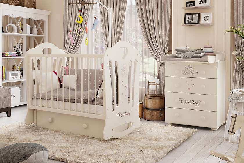 Белые детские кроватки этой серии можно купить в нескольких вариантах декора на ваш выбор.